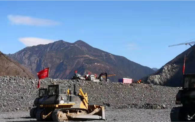SD32推土機(jī)進(jìn)行西南地區(qū)水電站壩體建設(shè),推土機(jī)將土、石子等松散物料進(jìn)行推移堆積,壓路機(jī)壓平,澆注混凝土形成壩體。