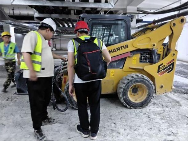 項(xiàng)目啟動(dòng)后,山推技術(shù)團(tuán)隊(duì)為客戶量身推薦了SSL75V-M滑移裝載機(jī),配置快換銑刨鼓及清掃器等屬具。面對(duì)地庫(kù)內(nèi)2.1米的高度限制,SSL75V-M整機(jī)高度僅2065mm,轉(zhuǎn)向靈活,在狹小空間內(nèi)表現(xiàn)出色;配套的大流量屬具液壓系統(tǒng),保障了銑刨鼓的動(dòng)力輸出,在硬質(zhì)水泥地面也能高效作業(yè),日均銑刨面積可達(dá)1000㎡,施工效率提升75%以上。