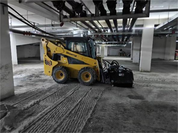 項(xiàng)目啟動(dòng)后,山推技術(shù)團(tuán)隊(duì)為客戶量身推薦了SSL75V-M滑移裝載機(jī),配置快換銑刨鼓及清掃器等屬具。面對(duì)地庫(kù)內(nèi)2.1米的高度限制,SSL75V-M整機(jī)高度僅2065mm,轉(zhuǎn)向靈活,在狹小空間內(nèi)表現(xiàn)出色;配套的大流量屬具液壓系統(tǒng),保障了銑刨鼓的動(dòng)力輸出,在硬質(zhì)水泥地面也能高效作業(yè),日均銑刨面積可達(dá)1000㎡,施工效率提升75%以上。