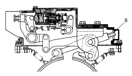 3)制動(dòng)帶抱緊制動(dòng)鼓后,再將螺母(B)擰松1-5/6圈,使制動(dòng)鼓與制動(dòng)帶間的間隙0.3mm。相應(yīng)地,制動(dòng)踏板的行程為90-110mm。