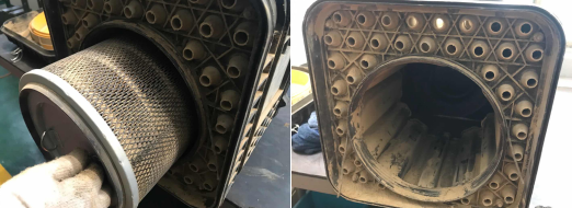 3、清理空氣濾清器一側(cè)的排灰閥,排除里面的灰塵。用氣槍清理濾芯時,要沿濾芯內(nèi)側(cè)向外側(cè)清理,切不可由外向內(nèi)吹(氣槍壓力在0.2MPa),請注意:濾芯在清理六次后應(yīng)進行更換。